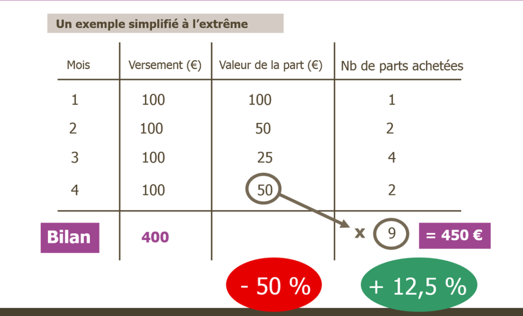 Quand la valeur de la part baisse, vous achetez en solde plusieurs parts. Au final, à moyen ou long terme, la Bourse étant cyclique, le retour de la part à sa valeur initiale voire plus, vous assure une plus-value du fait de l’augmentation du nombre de part détenu.